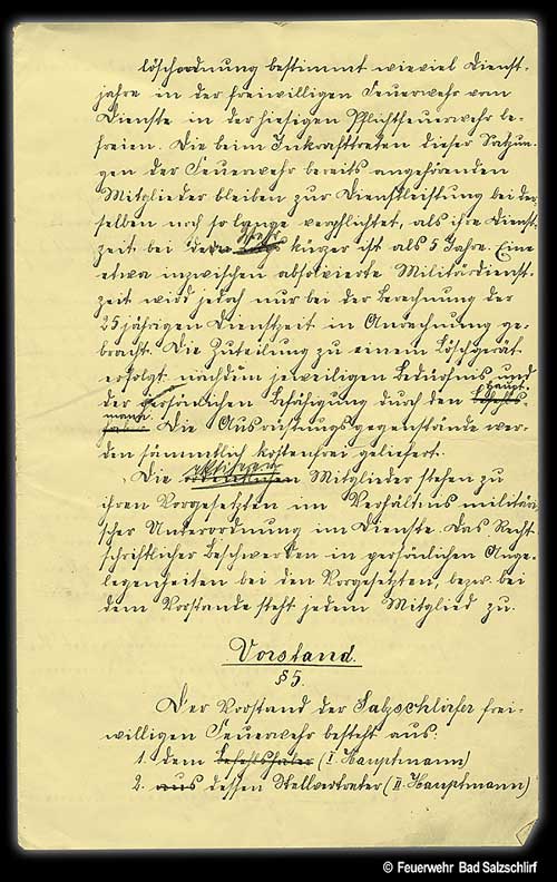 Die unter 1. und 4. genannten Mitglieder des Vorstandes gehen aus freiwilliger Wahl der Hauptversammlung hervor und werden auf 3 Jahre gewählt. Der Hauptmann ist durch die Ortspolizeibehörde zu bestätigen. Jeder Hauptmann oder Führer kann sowohl wegen dienstlicher Befähigung als auch aus disziplinarischen Gründen auf Antrag des Vorstandes der Salzschlirfer freiwilligen Feuerwehr durch den Gemeindevorstand jederzeit seines Amtes enthoben werden.