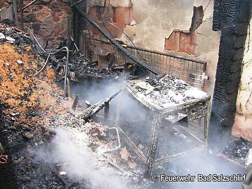 -Müs, -Bimbach, Der Brandschutzaufsichtsdienst, Kreisbrandinspektor Stefan Schmitt machte sich ebenso wie Bürgermeister Werner Dietrich vor Ort ein Bild von dem Einsatz. Bei dem Brand wurde der Holzanbau, diverse Gartengerätschaften und eingelagertes Heu und Stroh zerstört. Auch drei Kaninchen verbrannten in ihren Stallungen. Menschen waren nicht gefährdet und kamen auch nicht zu Schaden.