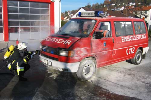 dem die Feuerwehr Bad Salzschlirf gegen 13.40 Uhr alarmiert wurde. In der Schlitzer Straße kam es dann zu einem Motorbrand im vorausfahrenden ELW, einem 20 jahre alten VW-Bus. Der Gemeindebrandinspektor Jürgen Schlei, der mit einer Kameradin und seinem Stellvertreter im Fahrzeug saß, hörte einen Knall aus dem Motorraum. Kurz darauf folgte bereits schwarzer Rauch. Geistesgegenwärtig fuhr er noch schnell die letzten 20 Meter bis auf den Feuerwehrhof, so dass das Fahrzeug auf freier Fläche stand. Mit einem Feuerlöscher wurde der Brand vorerst eingedämmt, während die anderen Kameraden das Tanklöschfahrzeug aus der Halle fuhren, um dann unter Atemschutz mit dem Schnellangriff den Brand zu löschen. Alle Insassen blieben unverletzt, am Fahrzeug entstand vermutlich Totalschaden. Nachdem der Brand gerade gelöscht war, musste die Schnellangriffseinrichtung alledings schnell wieder eingerollt werden, da es zu einem dritten Alarm kam. Die Brandmeldeanlage im Hotel Badehof hatte ausgelöst. An der Einsatzstelle angekommen, konnte glücklicherweise Entwarnung gegeben werden. In der Küche löste ein Rauchmelder, auf Grund von aufsteigendem Wasserdampf, aus.