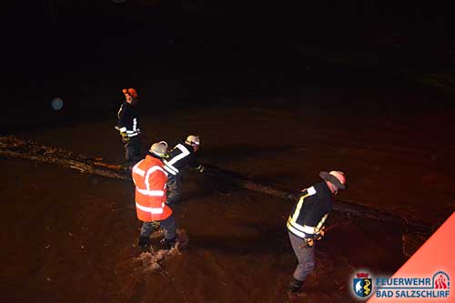 Die Kameraden waren noch mit den Reinigungsarbeiten der Fahrzeuge beschäftigt, als die nächste Alarmierung einging. Bei der neuen roten Brücke im Kurpark hatte sich auf Grund des zur Zeit hochwasserführenden Fluss Altefeld ein ca. 10m langer und ca. 50cm dicker Baumstamm in den Stützen der Brücke verkeilt und drohte erheblichen Schaden zu verursachen. Die Feuerwehr entfernte den Baumstamm mittels Kettensäge und räumte die Brücke von weiterem Treibholz frei.